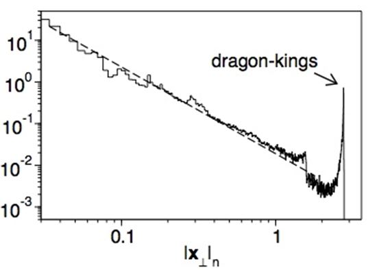Well, here’s the thing–it’s worse than that. A recent article by Didier Sornette of the Department of Physics and Earth Science at ETH Zurich, Dragon-Kings, Black Swans and the Prediction of Crises, discusses what he calls “life beyond power laws,” meaning “the existence of transient organization [of a system] into extreme events that are statistically and mechanistically different from the rest of their smaller siblings.” In short, he documents the existence of “genuine outliers,” events which don’t even follow the power law distribution. (In the power law graph shown above, sprinkle a few dots way out to the right of the chart and off the line.) The Black Swan event isn’t really an outlier, in other words, because it follows the power law and is simply an event way out on the tail. Genuine outliers violate the power law–they are even “wilder” than what would be predicted by the extrapolation of the power law distributions in their tails. A classic example is Paris–whereas all the populations of all other cities in France map well onto a power law, Paris is a genuine outlier. But Sornette documents that other such outliers exist in phenomena as varied as financial crashes, materials failure, turbulent velocities, epileptic seizures, and earthquakes. He calls such events Dragon Kings: dragon for “different kind of animal” and king to refer to the wealth of kings, which historically has been an outlier violating power law distributions of the wealth of their citizens. (Dragon Kings are also mythical Chinese shapeshifting deities ruling over water, as well as the name of some pretty good Chinese restaurants in cities around the U.S. according to Yelp.)